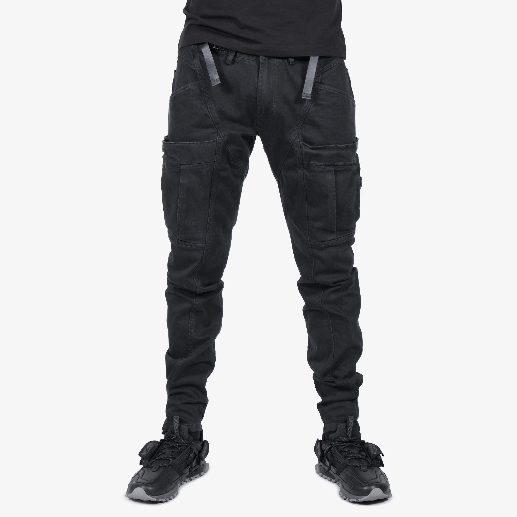 На передних половинках брюк по бокам расположены два глубоких внутренних кармана с горизонтальным входом.