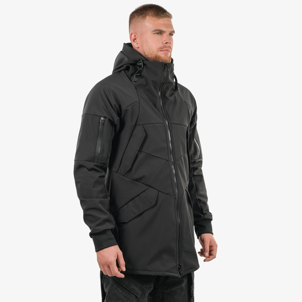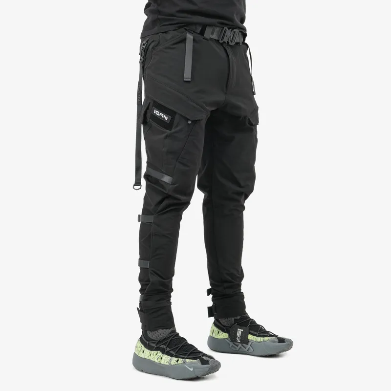 По бокам на уровне бедра по два больших кармана с молниями и клапанами на липучке. На каждом кармане дополнительно есть кармашек с клапаном и съемный патч с логотипом.