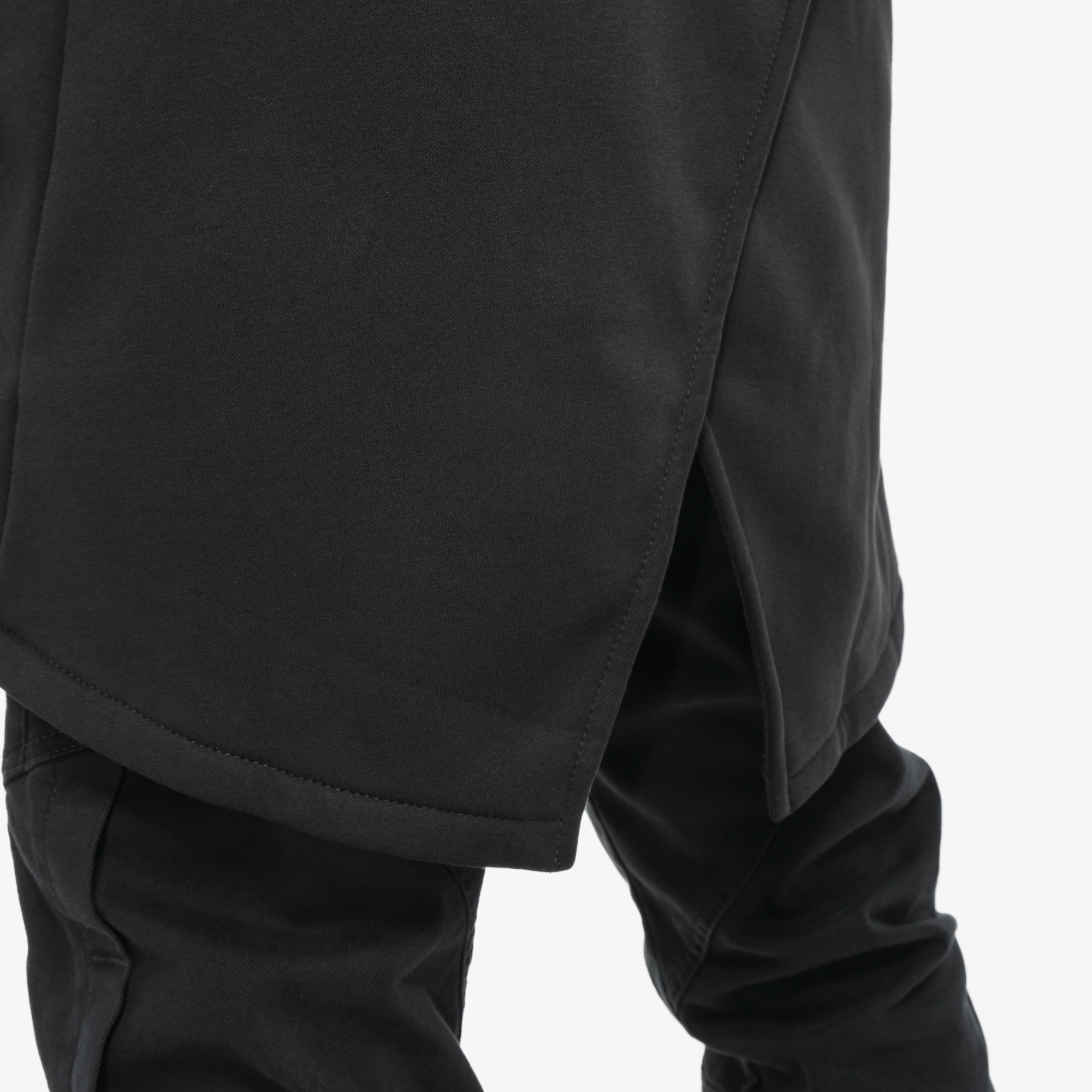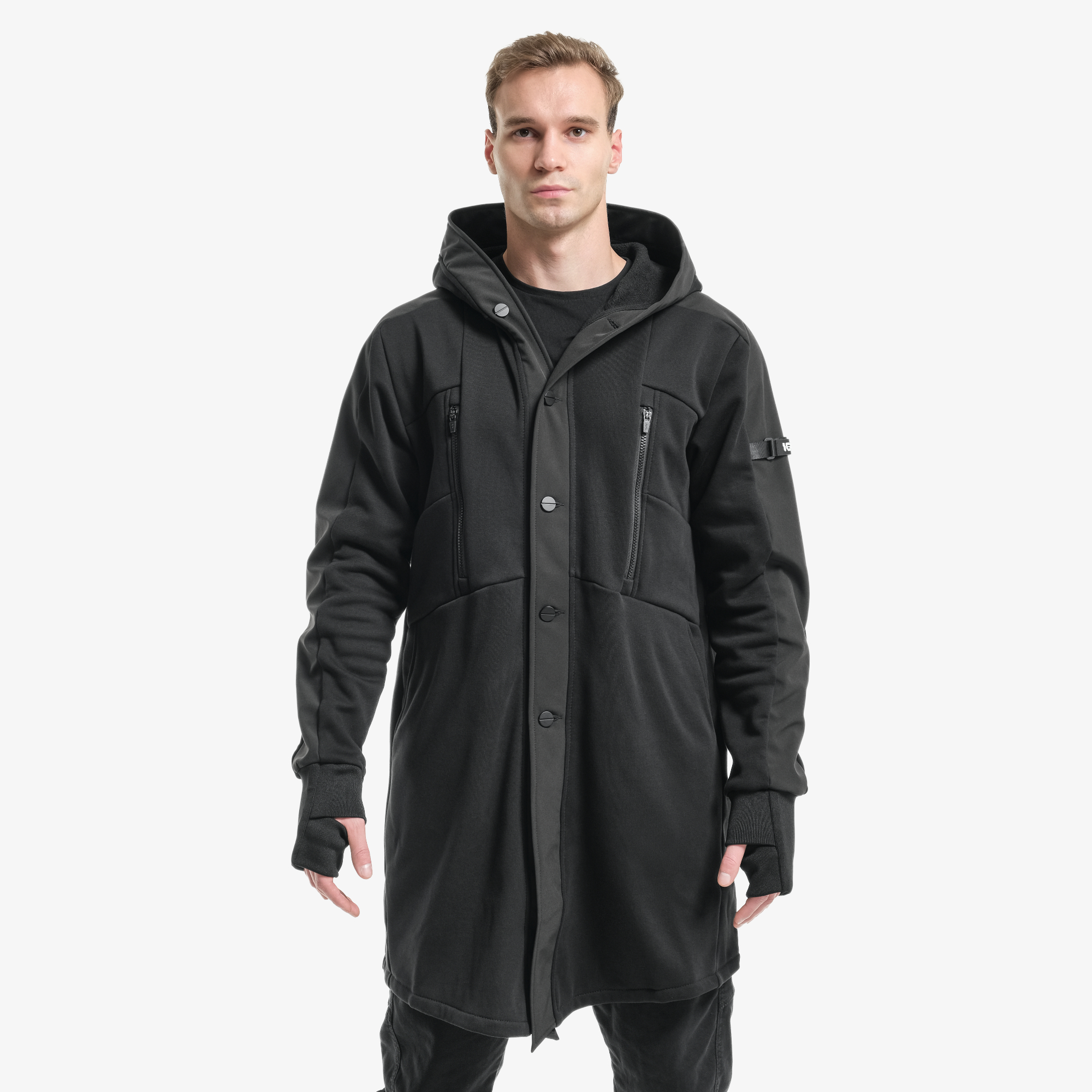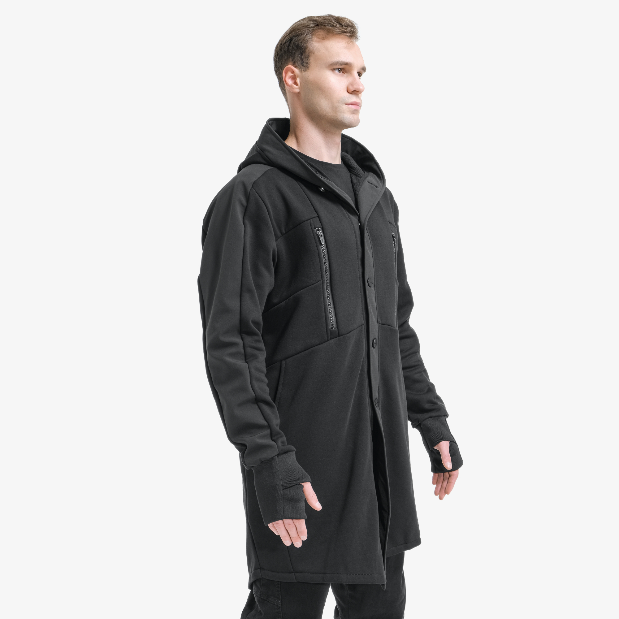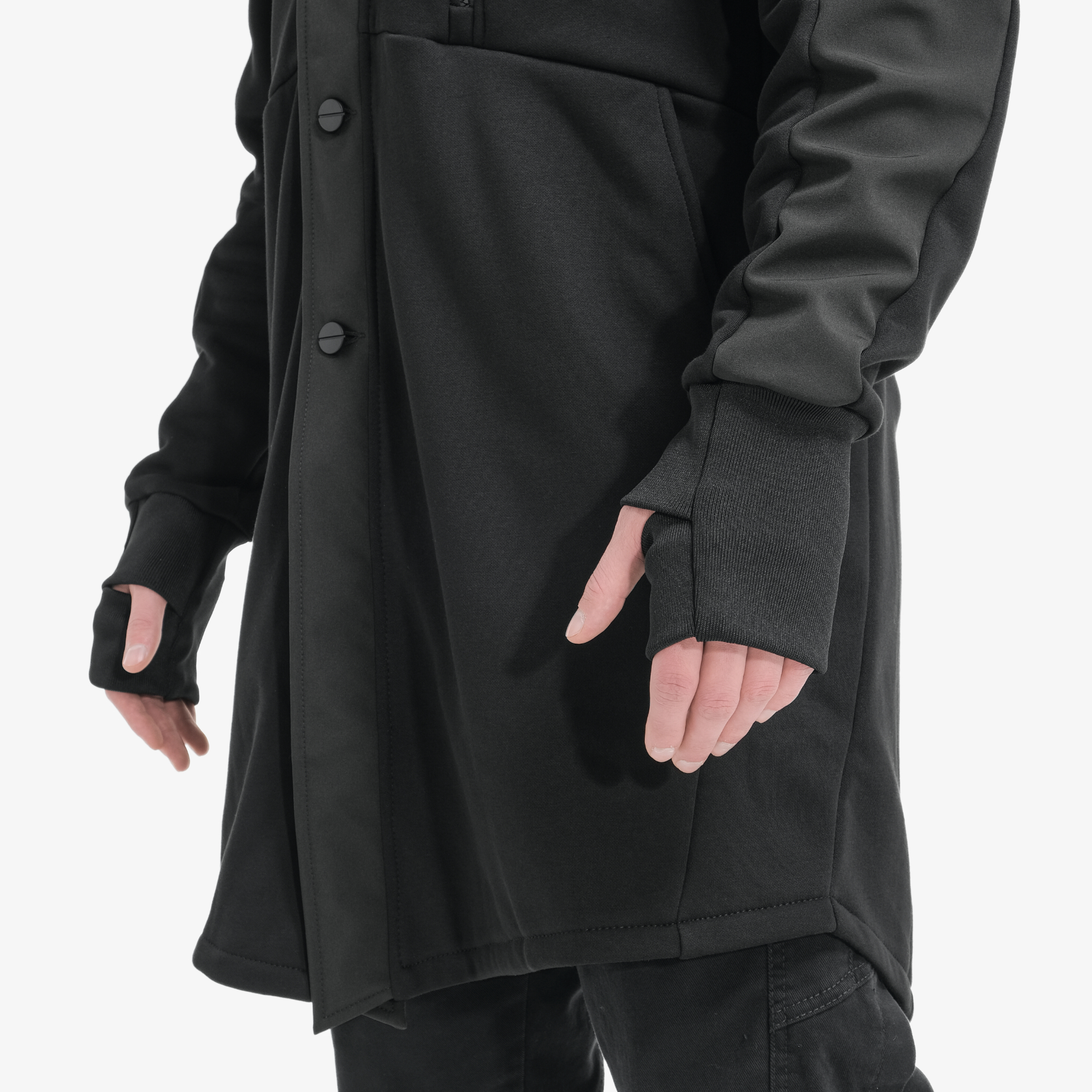 Низ рукава обработан эластичным манжетом с отверстием для пальца.